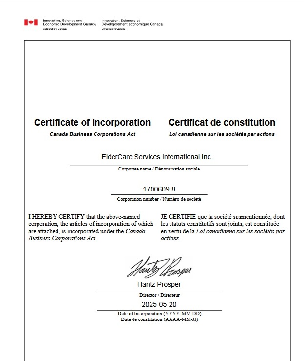 ElderCare Services filed its charter with Corporations Canada on May 20, 2025 under number 1700609-8 ( hereafter referred as ElderCare ) ElderCare.Services is more than a platform — it’s a mission to restore compassion, autonomy, and connectedness to the lives of older adults worldwide. With over 50 countries served and 25+ intelligent care modules, we are building a bridge between human warmth and AI-powered support.. email: info@eldercare.services